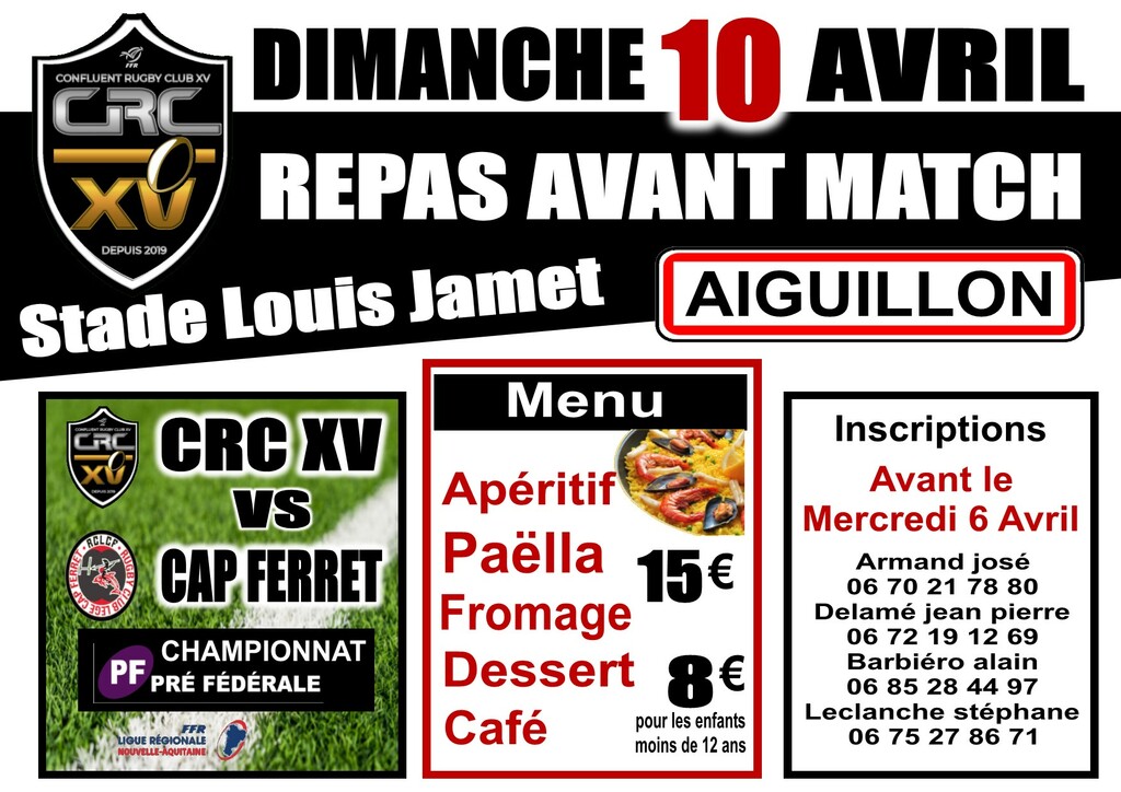Le 10 AVRIL prochain, pour déjà la dernière journée du championnat, les hommes du Confluent recevront Lège Cap Ferret et les dirigeants vous invitent à un convivial repas d'avant match au club house du stade Louis Jamet. Dès maintenant inscrivez vous auprès des contacts figurant sur l'affiche jointe pour retenir votre place.