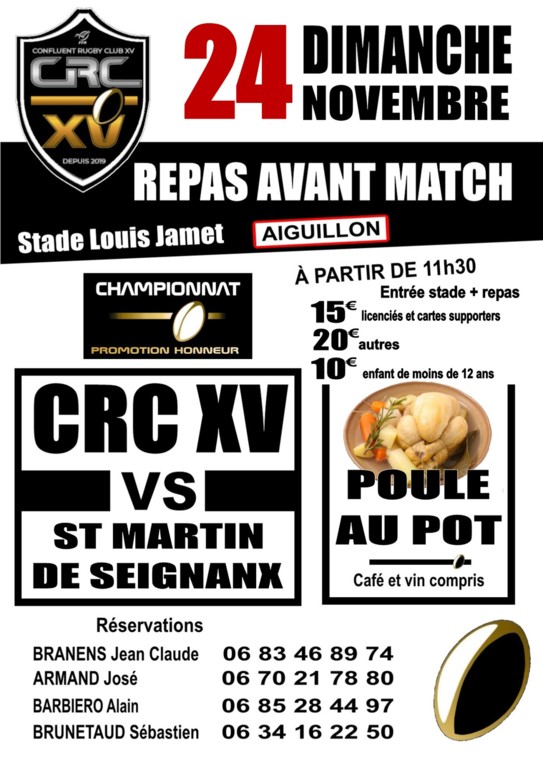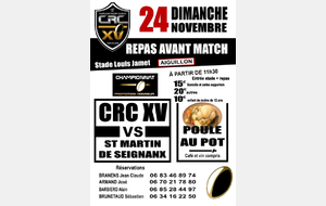 Le 24 NOVEMBRE à l'occasion du match CRC XV / SAINT MARTIN DE SEIGNANX , le club propose un repas d'avant match à 20 euros entrée comprise.